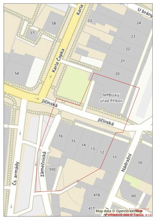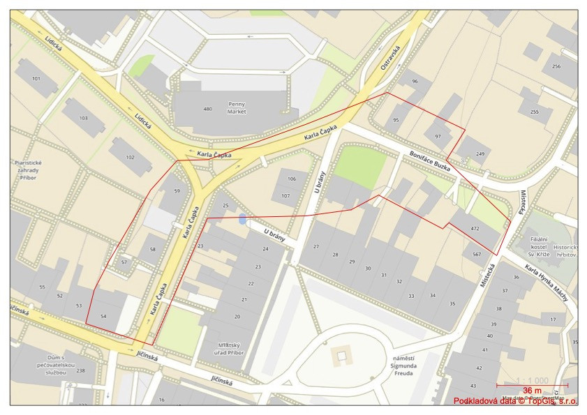 12021 Příbor, Příbor Karla Čapka ulice Karla Čapka, Ostravská, Bonifáce Buska, Lidická, Místecká, Jičínská, dle mapového podkladu