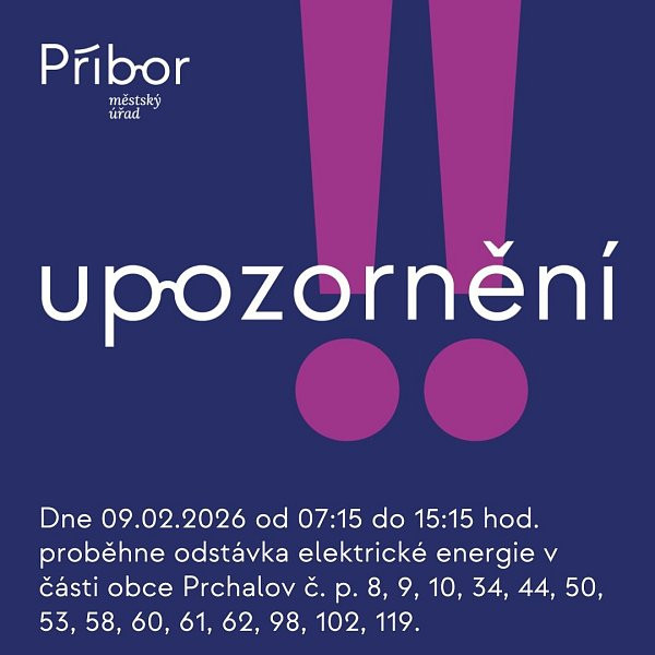 ČEZ Distribuce oznamuje, že dne 09.02.2026 od 7:15 do 15:15 hod. dojde k odstávce elektrické energie v části obce Prchalov č. p. 8, 9, 10, 34, 35, 44, 50, 53, 58, 60, 61, 62, 98, 102, 119, kat. území Prchalov (kód 733067): parcelní č. 31/5.