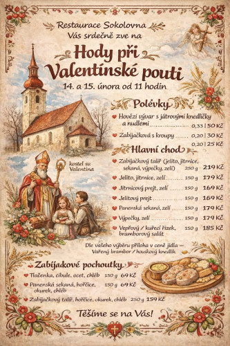Hned vedle se koná tradiční Valentinská pouť a Restaurace Sokolovna k této příležitosti chystá poctivé Zabijačkové hody! 🍖 Pokud tedy vaše drahá polovička raději jelítko a výpečky než svíčky, tohle je to pravé místo. 🥟