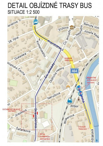 Zastávka „Příbor, železniční stanice“ bude dočasně přemístěna na ulici Nerudovu, kde bude označena a upravena: