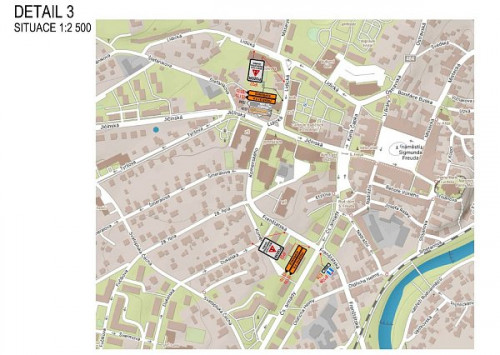Ulice Nerudova, která je nyní zaslepena a nepřístupná z ulice Frenštátské, bude během stavby dočasně průjezdná pro autobusy. Betonové zábrany na vjezdu budou odstraněny.