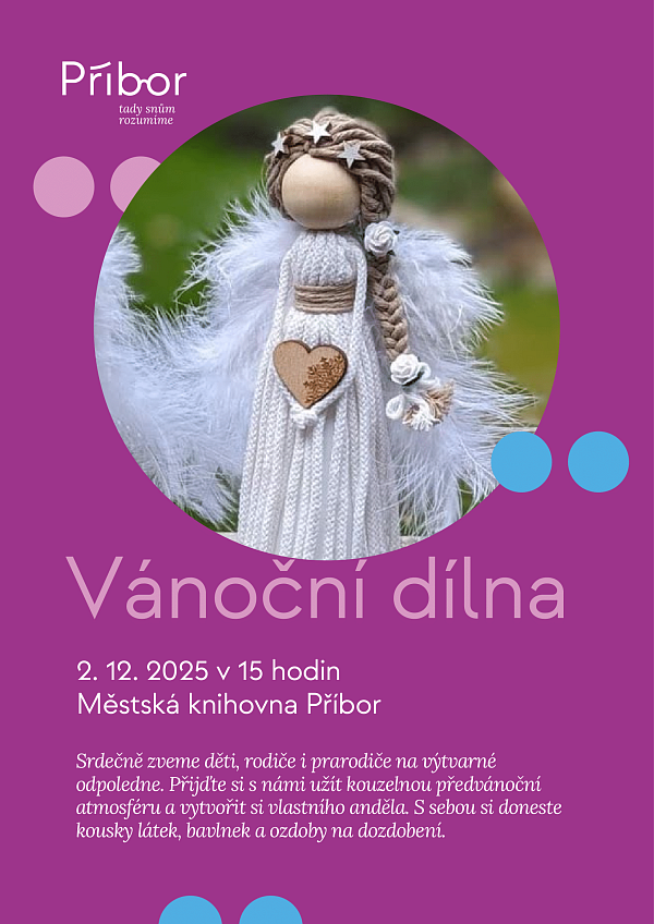 Přijďte si s námi užít kouzelnou předvánoční atmosféru a vytvořit si vlastního anděla. S sebou si doneste kousky látek, bavlnek a ozdoby na dozdobení.