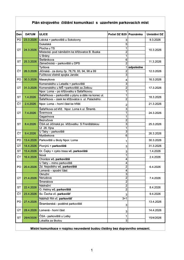 Úklid bude probíhat od konce března do konce dubna 2026 a v jednotlivých dnech se vždy zaměří na konkrétní lokality. Součástí prací bude také dočasné dopravní značení, které upozorní na zákaz zastavení v době čištění.