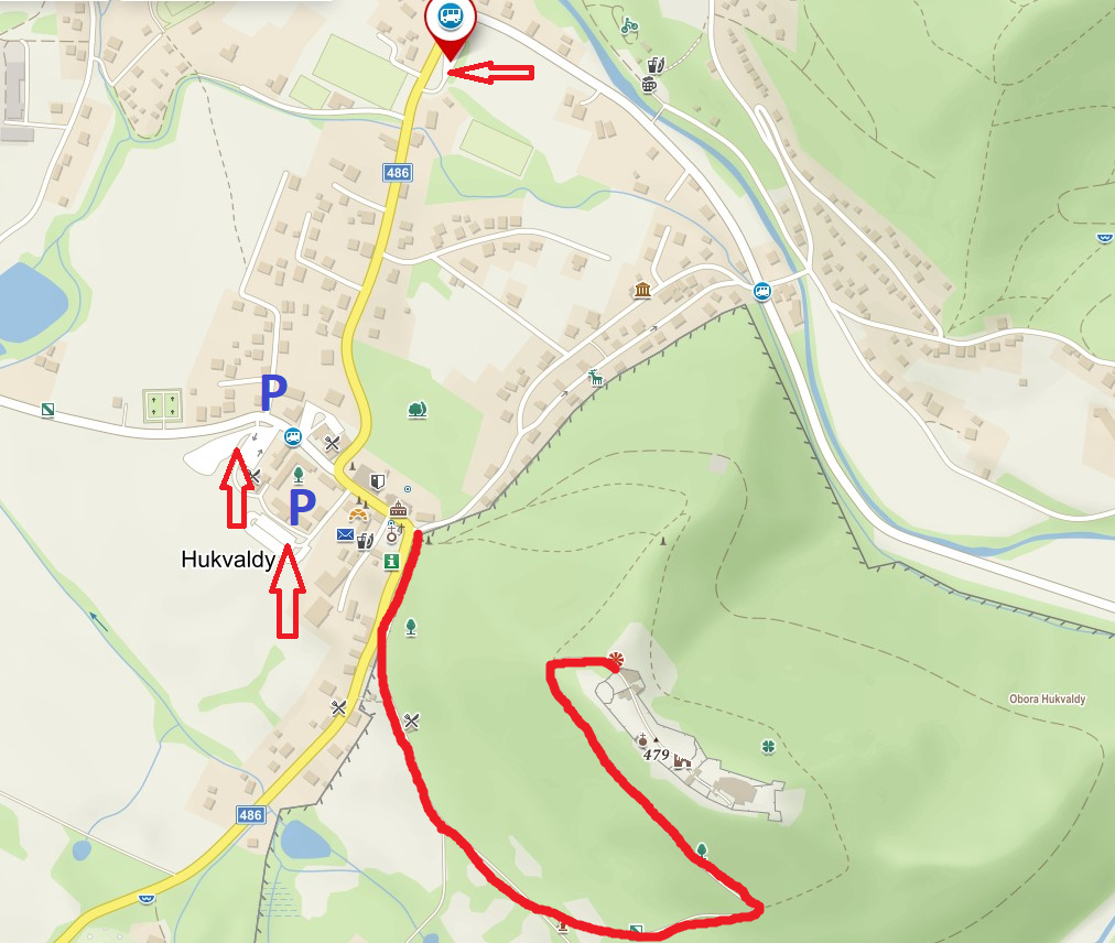 K hradu se poté dostane pěší zónou v Oboře Hukvaldy po asfaltové cestě - červená turistická značka. Cesta trvá zhruba 20 minut pěší chůze. V Oboře Hukvaldy se prosím pohybujte výhradně po značených stezkách.