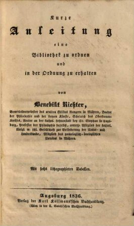 Bibliotekářství: Vydal dílo Kurze Anleitung eine Bibliothek zu ordnen und in der Ordnung zu erhalten (Krátké uvedení, jak pořádat knihovnu a jak ji v pořádku udržet, 1836), které reflektovalo jeho práci v Rajhradě.
