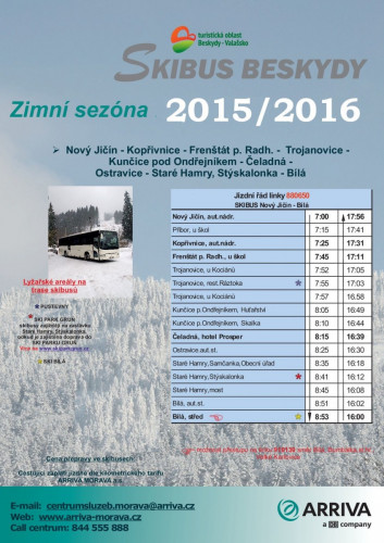 Autobus s možností přepravy lyží bude jezdit v soboty a neděle na trase Nový Jičín – Bílá. Poprvé vyjede v sobotu 5. února. Autobus nebude mít v zimním období vozík na přepravu jízdních kol, která bude možné přepravovat pouze jako zavazadla uvnitř autobusu, pokud to dovolí kapacita vozidla. Ve skibusu bude ale umožněna přeprava běžek i sjezdových lyží, které v běžných spojích přepravovat nelze.