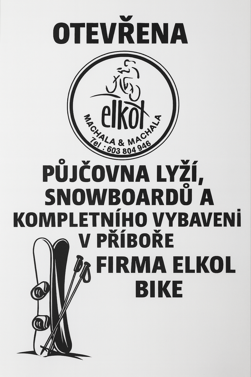 Vážení zákazníci ode dne 15.10 2025 je otevřena nová provozovna v Novém Jičíne ul. Hoblíkova 27 zelený dům na levé straně nebo sběrna servisu lyží a půjčovna prodej na náměsti v Příboře v prodejně kol Elkol P. Machala